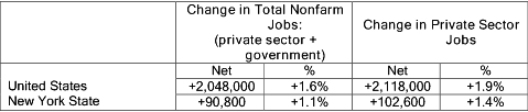 - Since January 2012, the number of private sector jobs in the state increased by 1.4% and the nation’s private sector job count increased by 1.9% (NYS Dept. of Labor)