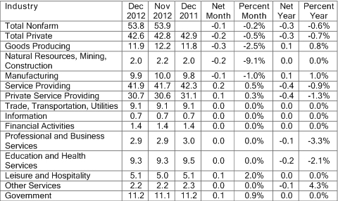 - From Dec. 2011 to December 2012, most of the industry sectors in Chautauqua County saw a level or slight decrease, but overall employment in the manufacturing sector increased slightly by 1.0% for the year. See the chart below: