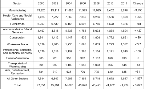 Source: U.S. Census Bureau County Business Patterns- Manufacturing and retail and wholesale trade, as well as professional, scientific and technical services saw losses in the number of employees